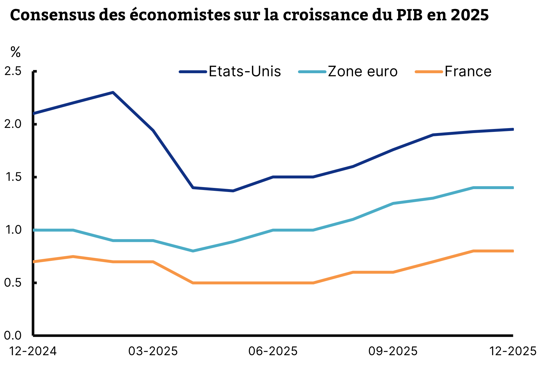 Retour à la case départ. Du point de vue macroéconomique, la trajectoire des prévisions aura été celle d’un retour à la case départ. Fin 2024, les investisseurs s’attendaient à une croissance molle aux Etats-Unis (2,1%) et en Europe (1,0%). Après une inquiétude transitoire autour des annonces de droits de douanes par la nouvelle administration Trump en avril (le fameux ‘Liberation Day’), ces prévisions ont fléchi, notamment aux Etats-Unis, pour finalement revenir à leur point de départ, à mesure que les impacts de ces droits de douane étaient réduits, voire effacés (Graphique 1). La trajectoire est quasiment la même pour la France, mais sur des niveaux plus bas. Celle de la zone euro est différente, à mesure que l’Europe du Sud surprenait positivement pour terminer sur des niveaux de croissance franchement bons (Espagne 2,9%).