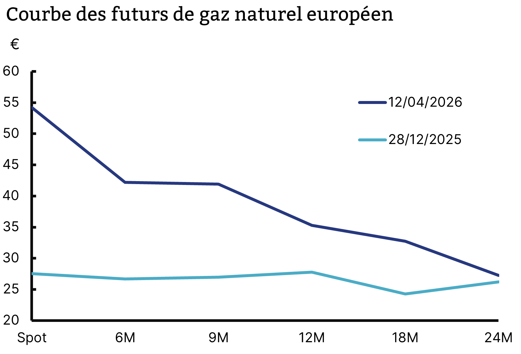 Urgent d’attendre. Reste à mesurer les effets de long terme de ce conflit, notamment les prix de l’énergie suite à la destruction d’infrastructures au Moyen-Orient. Les marchés semblent optimistes concernant le pétrole, pour lequel les futures anticipent un retour à 80$ le baril fin 2026, mais beaucoup plus circonspects sur le gaz naturel qui pourrait rester élevé longtemps (Graphique 1). Les effets de bord sont aussi importants sur les prix alimentaires qui reflètent l’augmentation du coût des transports. L’impact sur l’inflation n’est donc pas à négliger puisqu’elle pourrait dépasser 3% en 2026 en zone euro. La BCE est devant un dilemme pour sa réunion du 30 avril mais nous continuons de penser qu’elle devrait se donner du temps pour apprécier l’étendue des dégâts avant de prendre une décision. Le consensus table toujours sur des hausses de taux de 2026 mais nous ne sommes pas convaincus.