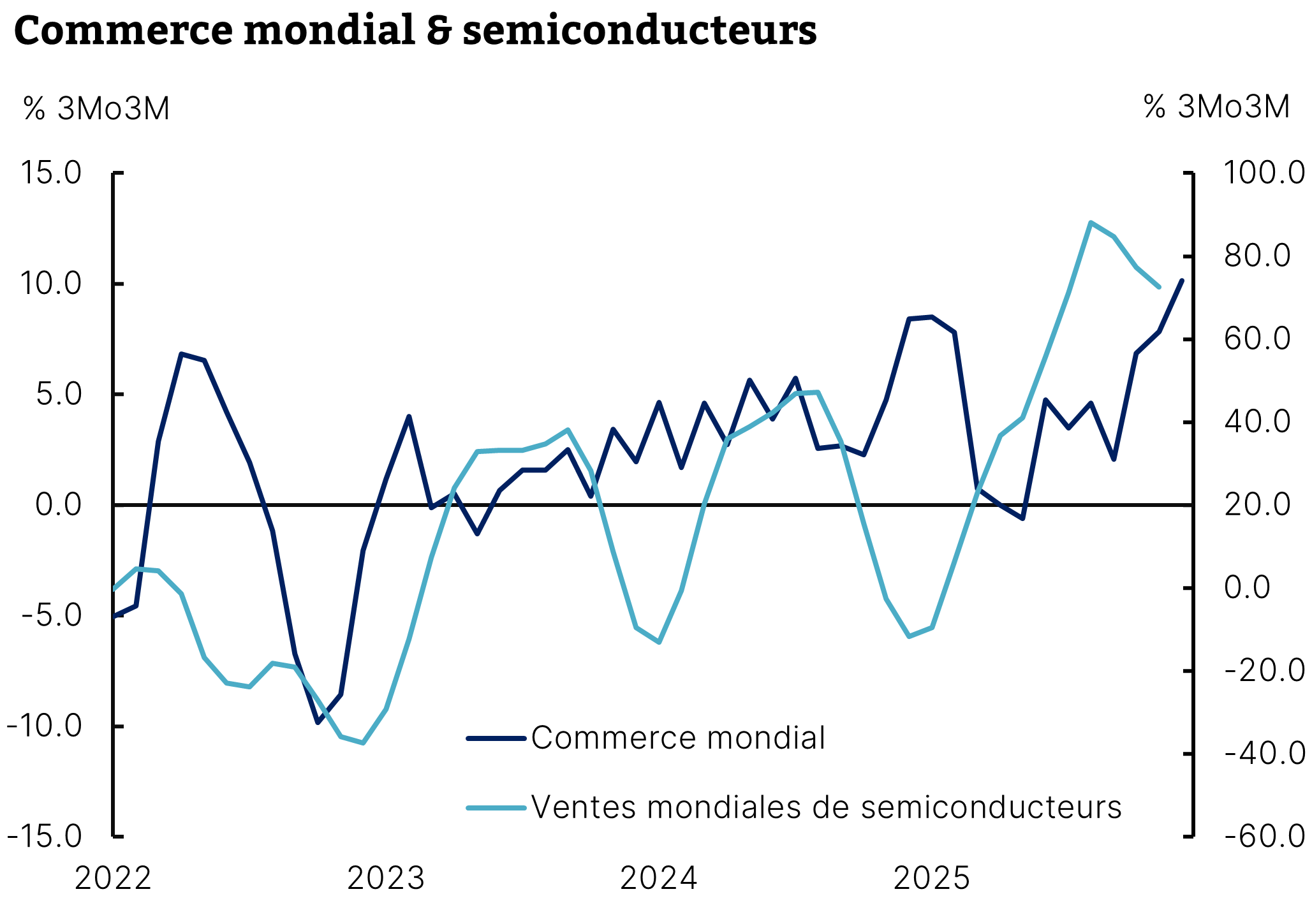 Et pourtant elle tourne. Malgré le bruit, les données d’activité économique s’entêtent à rester bien orientées. Les données d’enquête ont faibli logiquement en mars mais avaient entamé un rebond début 2026 qui devrait se poursuivre. La production industrielle s’est stabilisée, notamment en Allemagne. Et surtout, deux moteurs de l’économie mondiale fonctionnent : le commerce international et le consommateur américain. Le premier donne des signes clairs de rebond, notamment sous l’impulsion des semiconducteurs qui reflètent les efforts d’investissement des entreprises à l’ère de l’IA (Graphique 2). Le second ne dément pas son dynamisme en dépit de la hausse des prix.