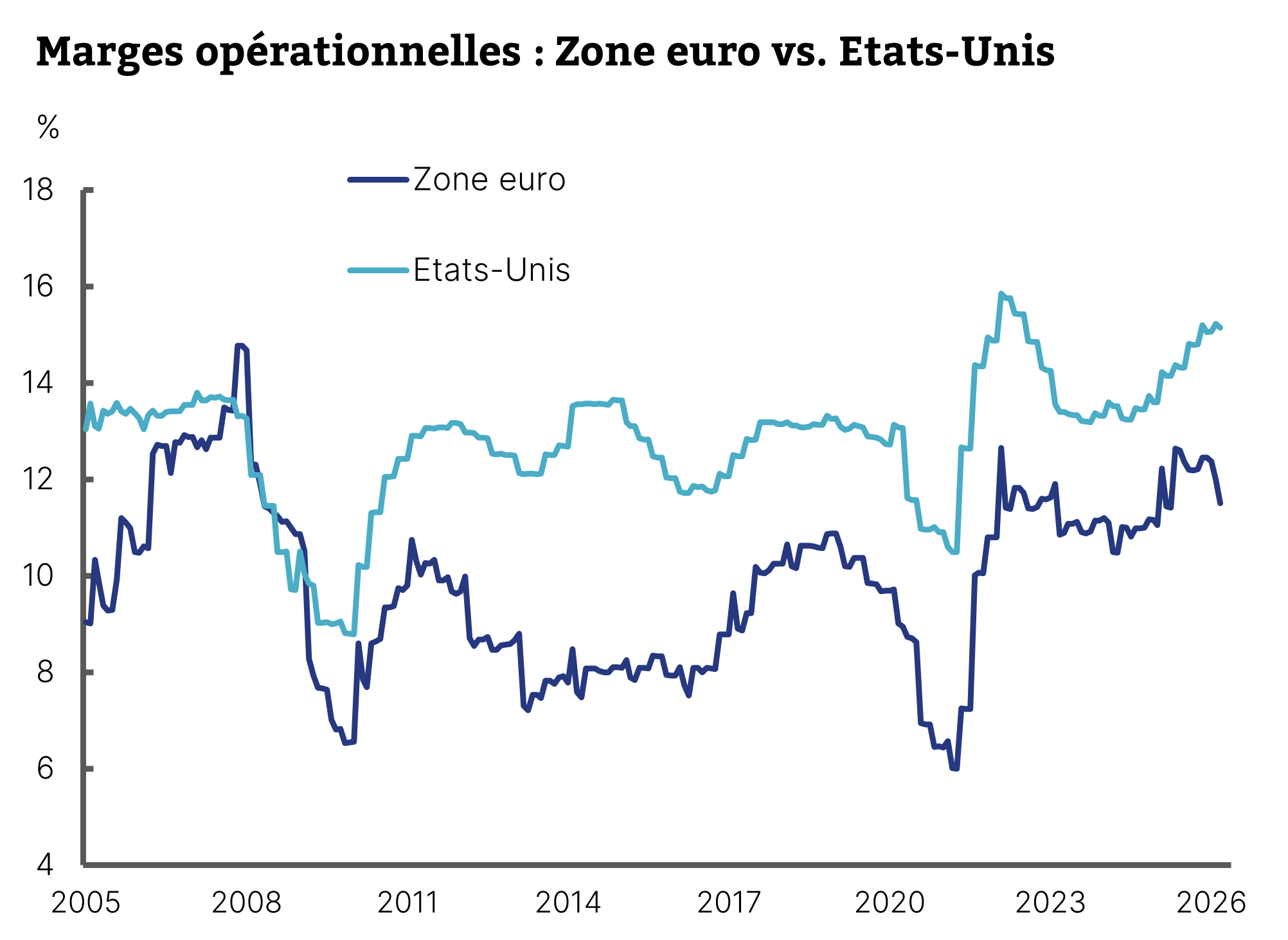 Tech is back. Au-delà des facteurs de court-terme, les fondamentaux restent porteurs sur les marchés actions. La dynamique bénéficiaire est favorable grâce à des marges opérationnelles exceptionnelles aux Etats-Unis et en redressement en Europe (Graphique 3). La saison des résultats qui vient de commencer confirme ce diagnostic avec une majorité de surprises positives. Un secteur sort particulièrement du lot, la technologie américaine. Pour ne rien gâcher, la valorisation du secteur est repassée en dessous de celle du marché au global, ce qui n’avait pas été le cas depuis 2021. Nous avons donc renforcé ce secteur récemment dans les allocations.