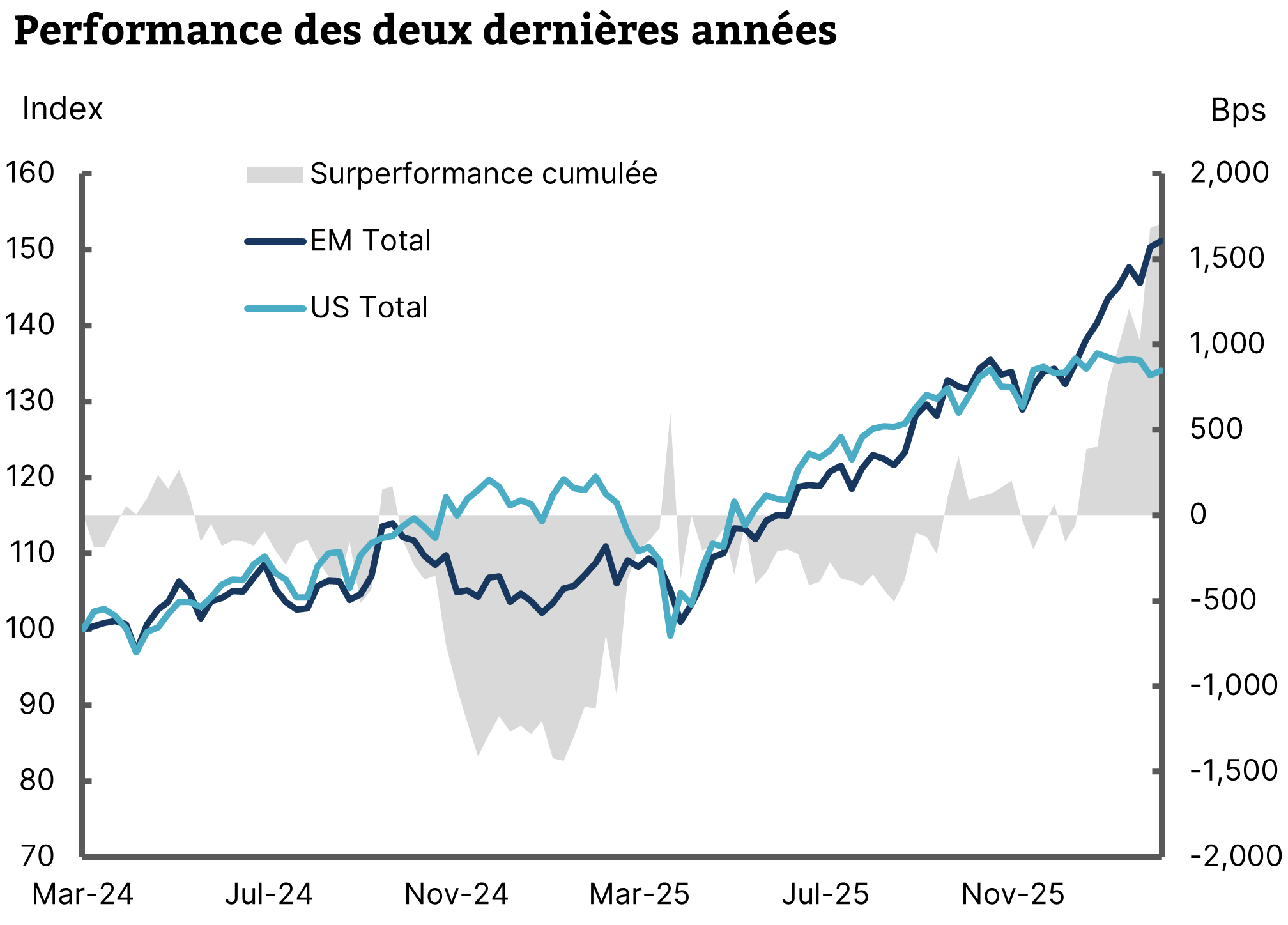 Divergence. Enfin, beaucoup de questions demeurent sur le dollar. Nous restons d’avis que le dollar ne devrait pas baisser davantage par rapport à l’euro, même si les deux changements à la tête des banques centrales accentuent l’incertitude. Force est de constater que le dollar reste stable depuis juin 2025 dans une fourchette entre 1,15 et 1,18 et que si nous avons brièvement touché 1,20, le marché n’a pas tenu. En revanche, nous anticipons une divergence dans le sens où le dollar pourrait s’affaiblir contre d’autres devises, notamment émergentes, qui restent fortement sous-évaluées.